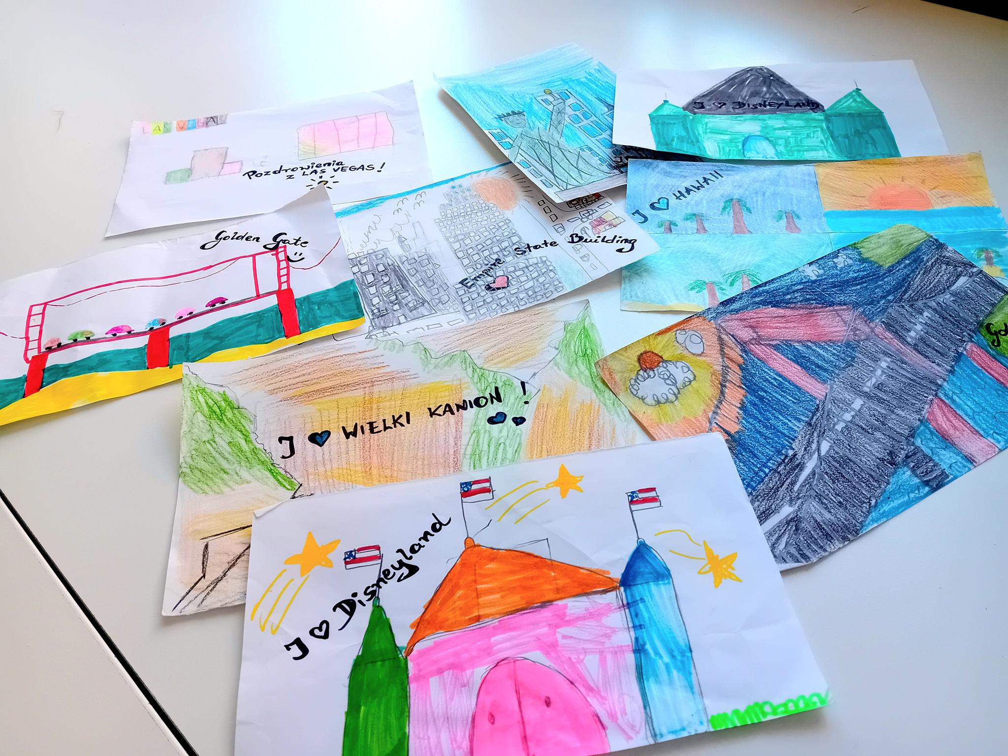 Podczas zajęć uczniowie stworzyli piękne pocztówki z najbardziej znanych miejsc USA – pojawił się Wielki Kanion, Statua Wolności, most Golden Gate, Disneyland, Biały Dom oraz Empire State Building. 🗽🏜️🌉
