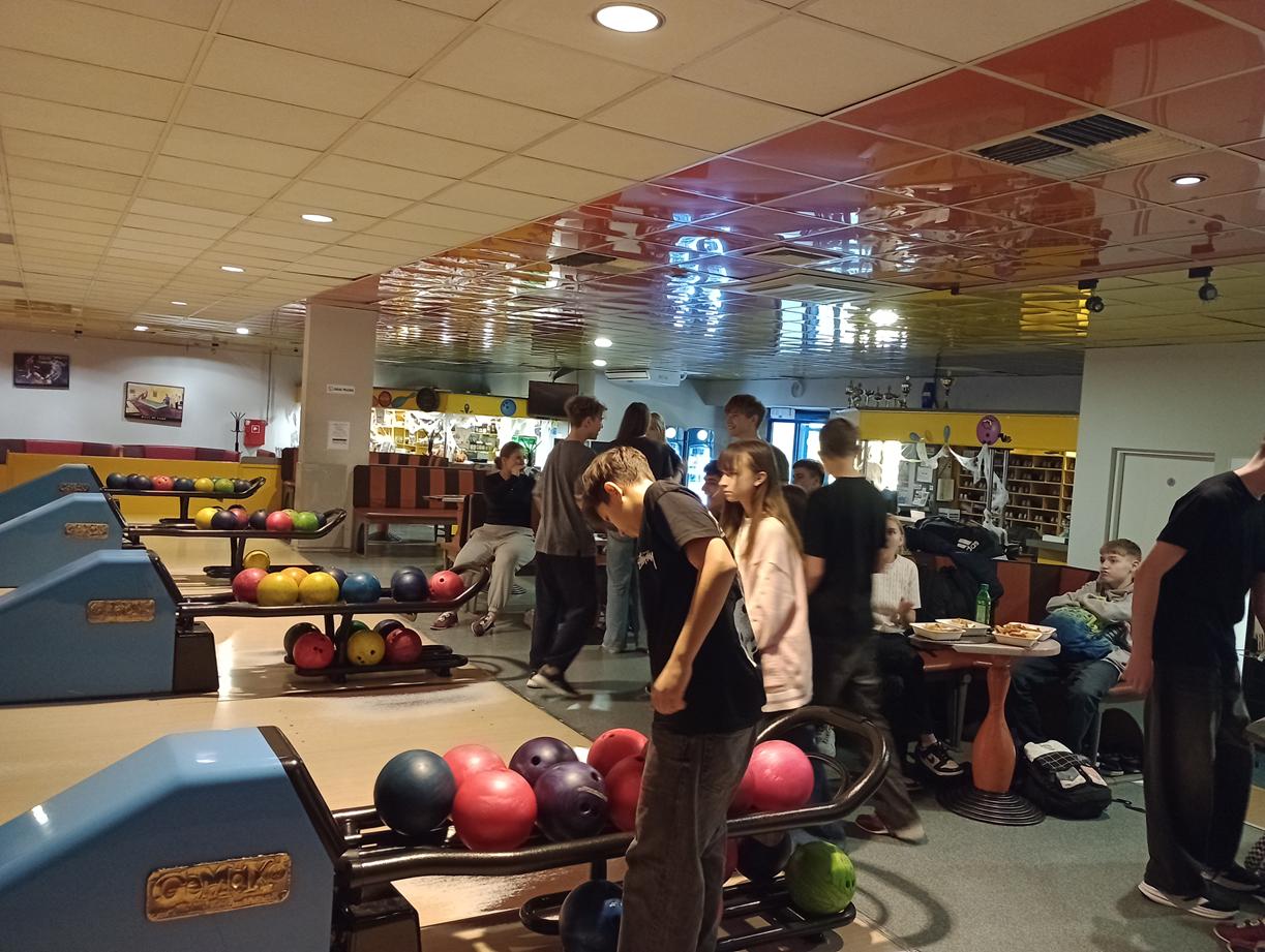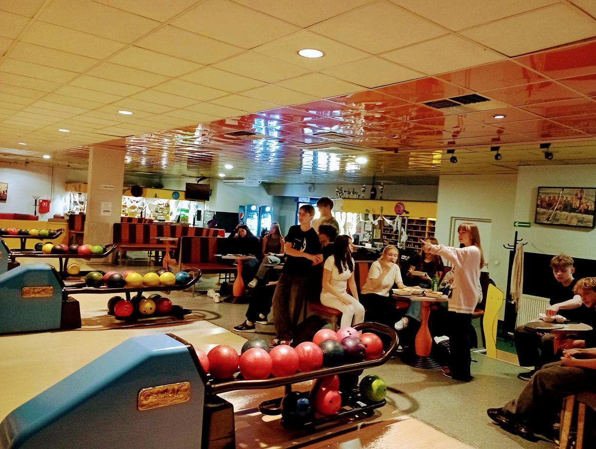 Na miejscu czekało wiele atrakcji. Uczniowie z zapałem rywalizowali w grze w kręgle, próbując swoich sił w rzutach do celu i walcząc o jak najlepszy wynik. Nie zabrakło też emocji przy stołach bilardowych, gdzie toczyły się równie zacięte, ale pełne uśmiechu rozgrywki.