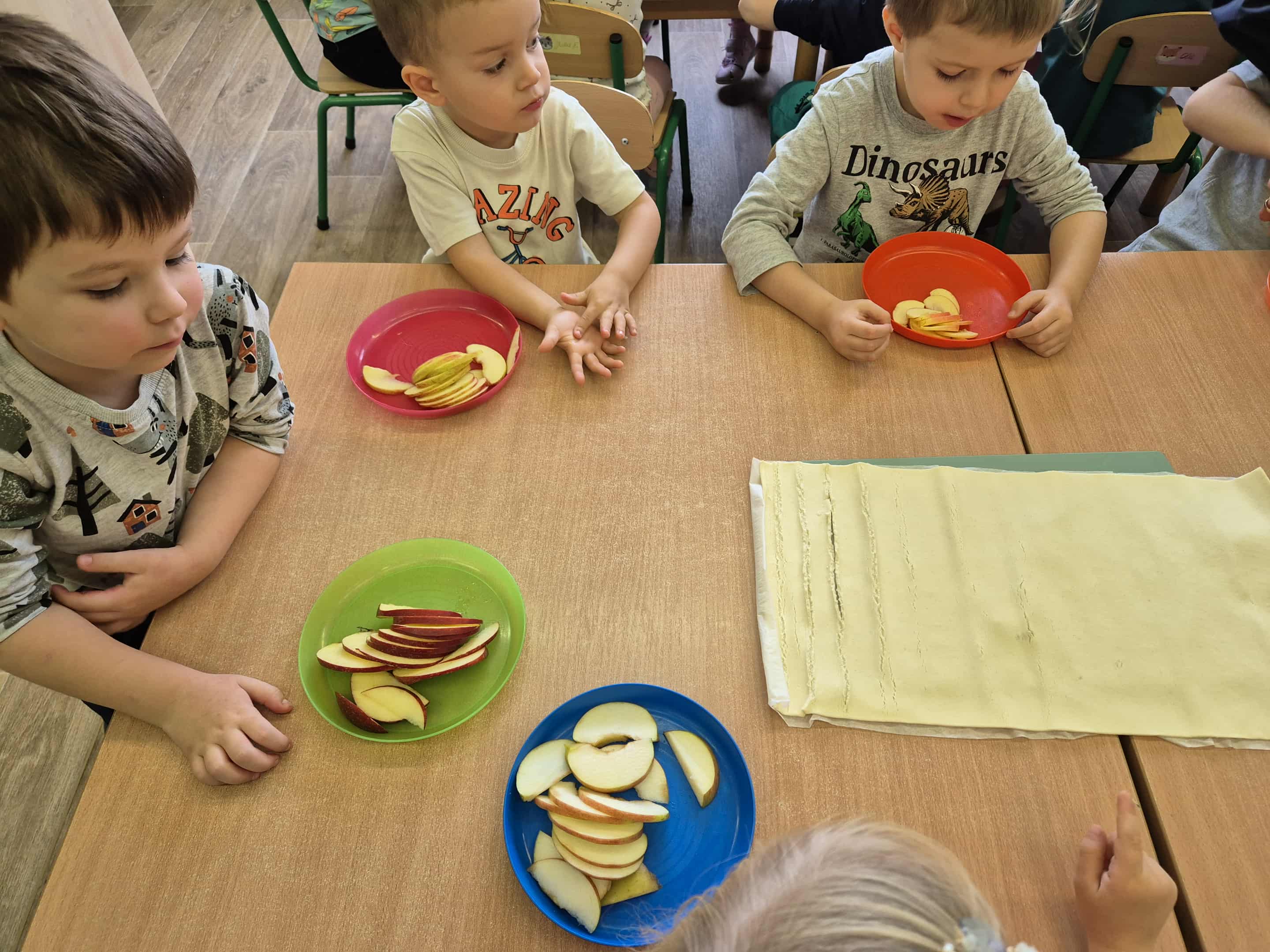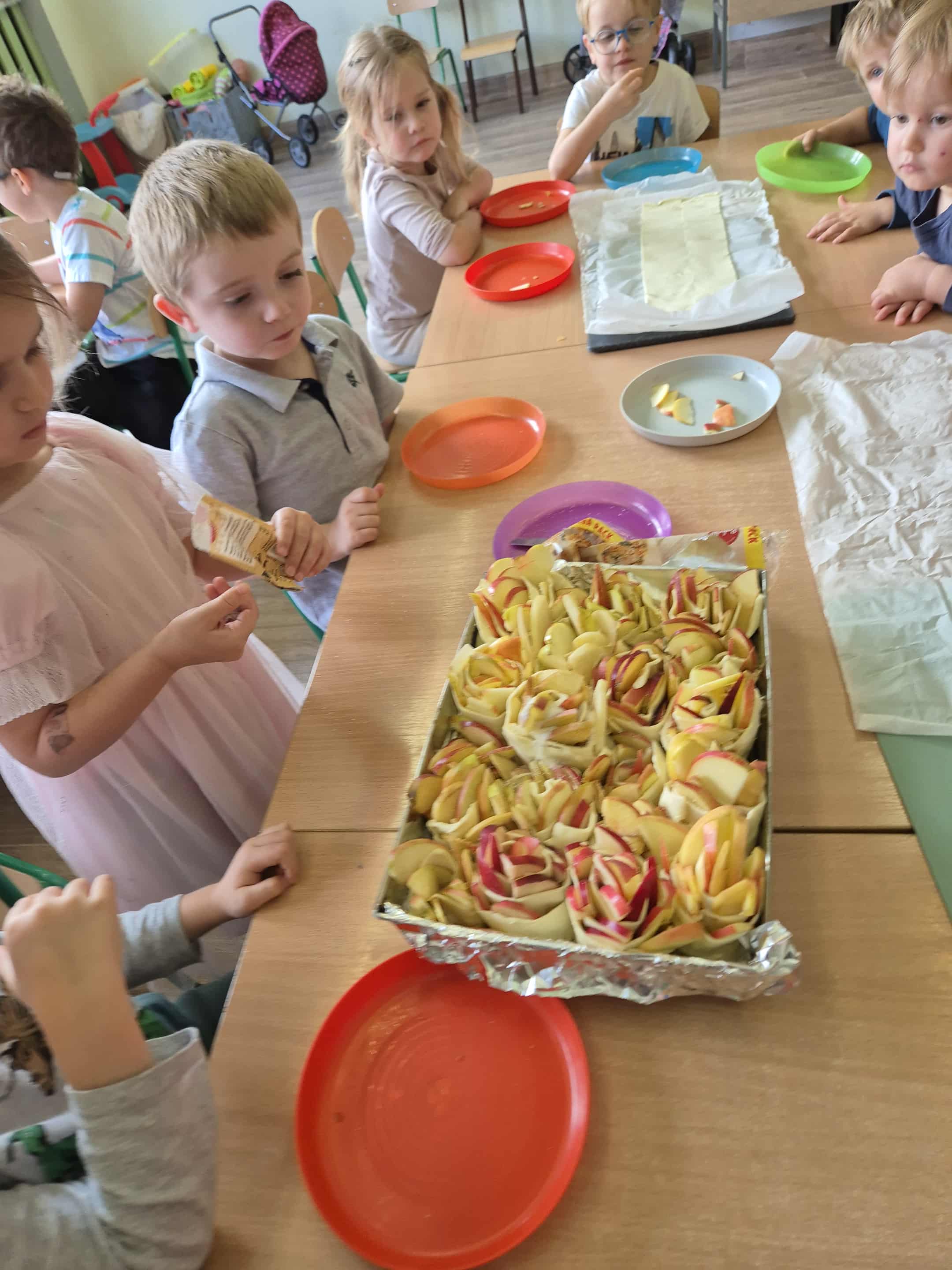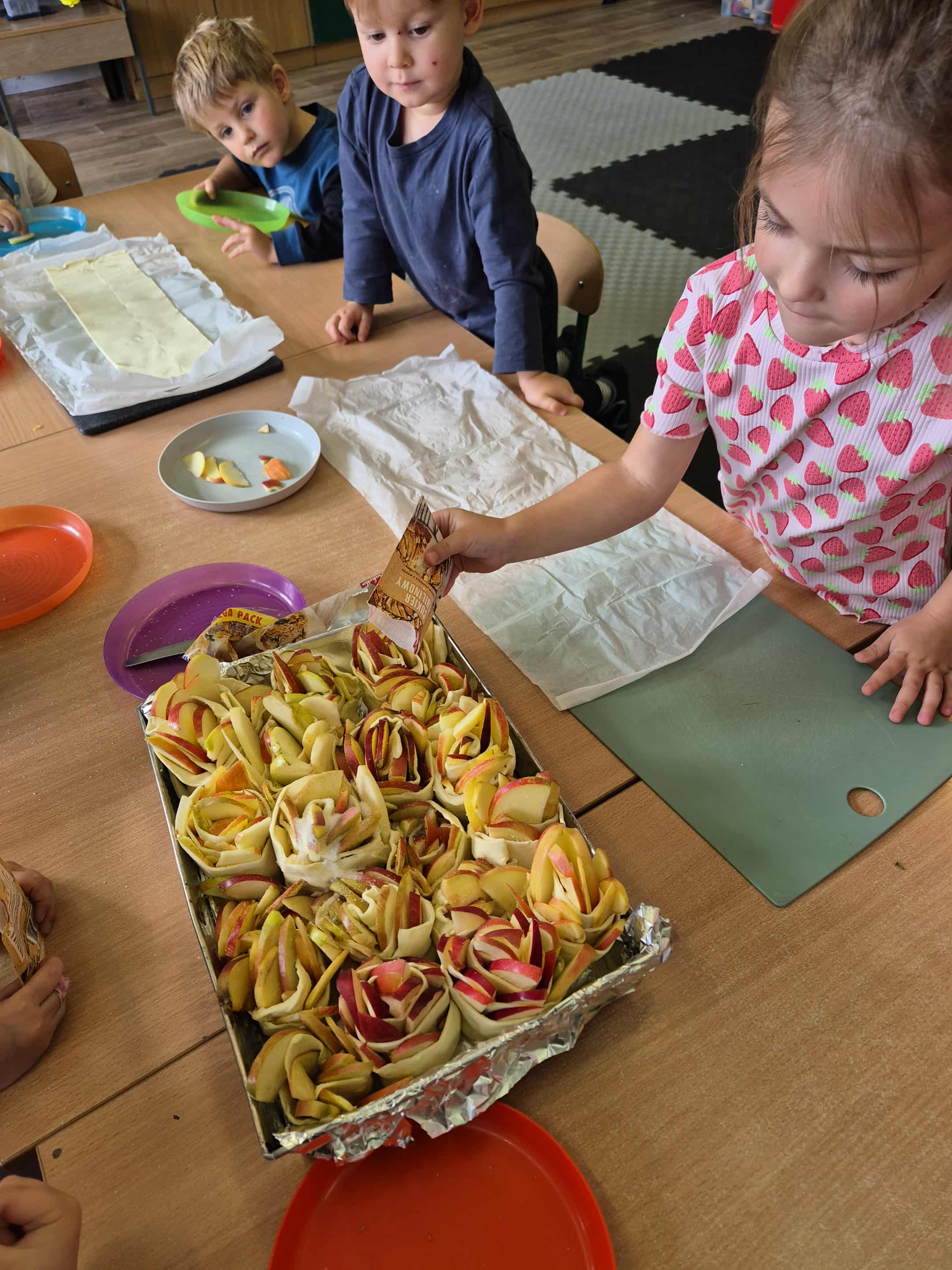 W ostatnich dniach grupa Zajączków ruszyła w podróż kulinarną dookoła świata w ramach innowacji pedagogicznej. Dzieci poznały podstawowe informacje o danym kraju, tym razem była to Polska oraz wykonując pierwsze zadanie kulinarne, którym były róże jabłkowe w cieście francuskim. Zabawy, smaków i radości nie było końca, a zapach pieczonego jabłka jeszcze długo unosił się po przedszkolnym korytarzu.