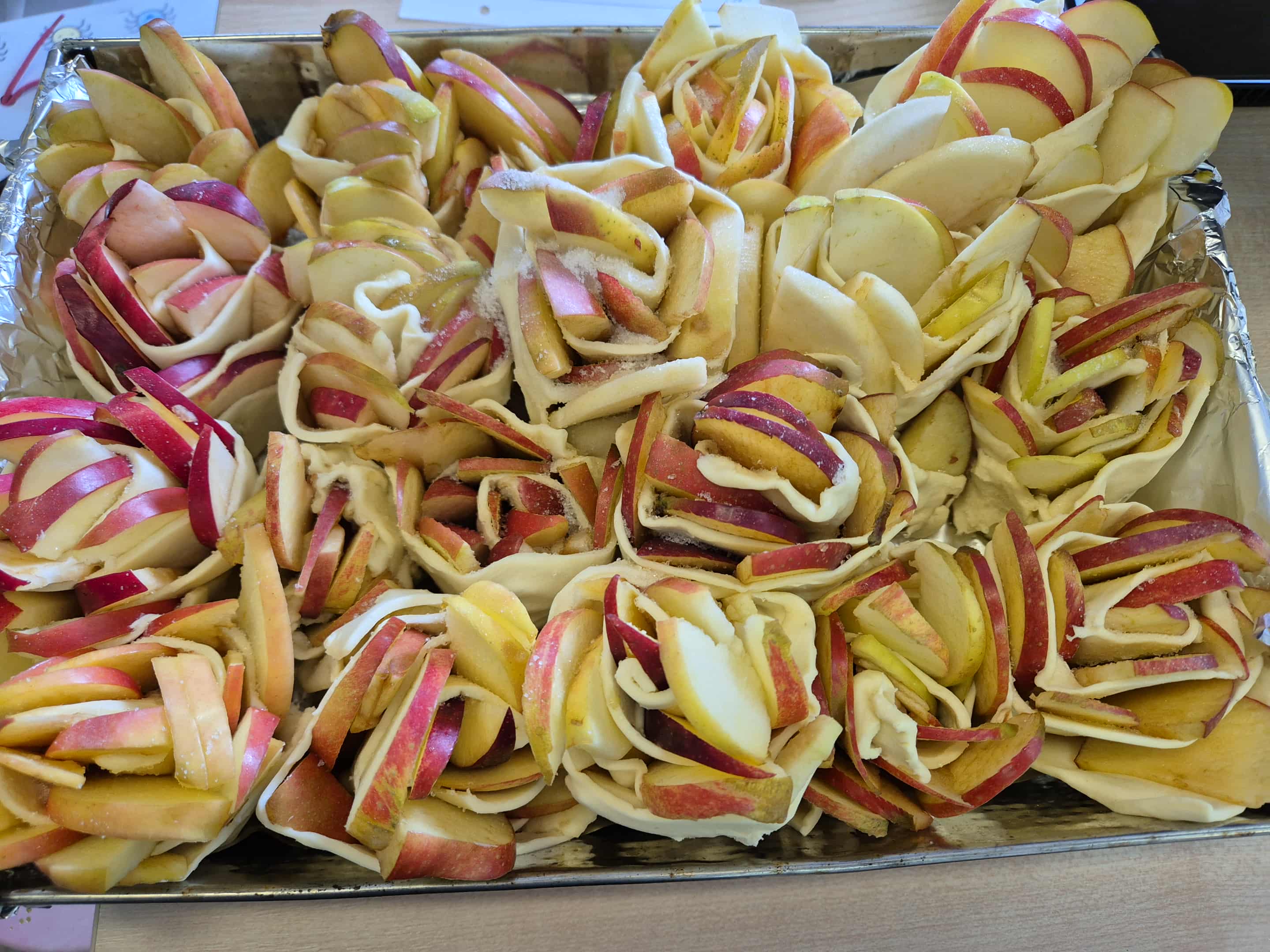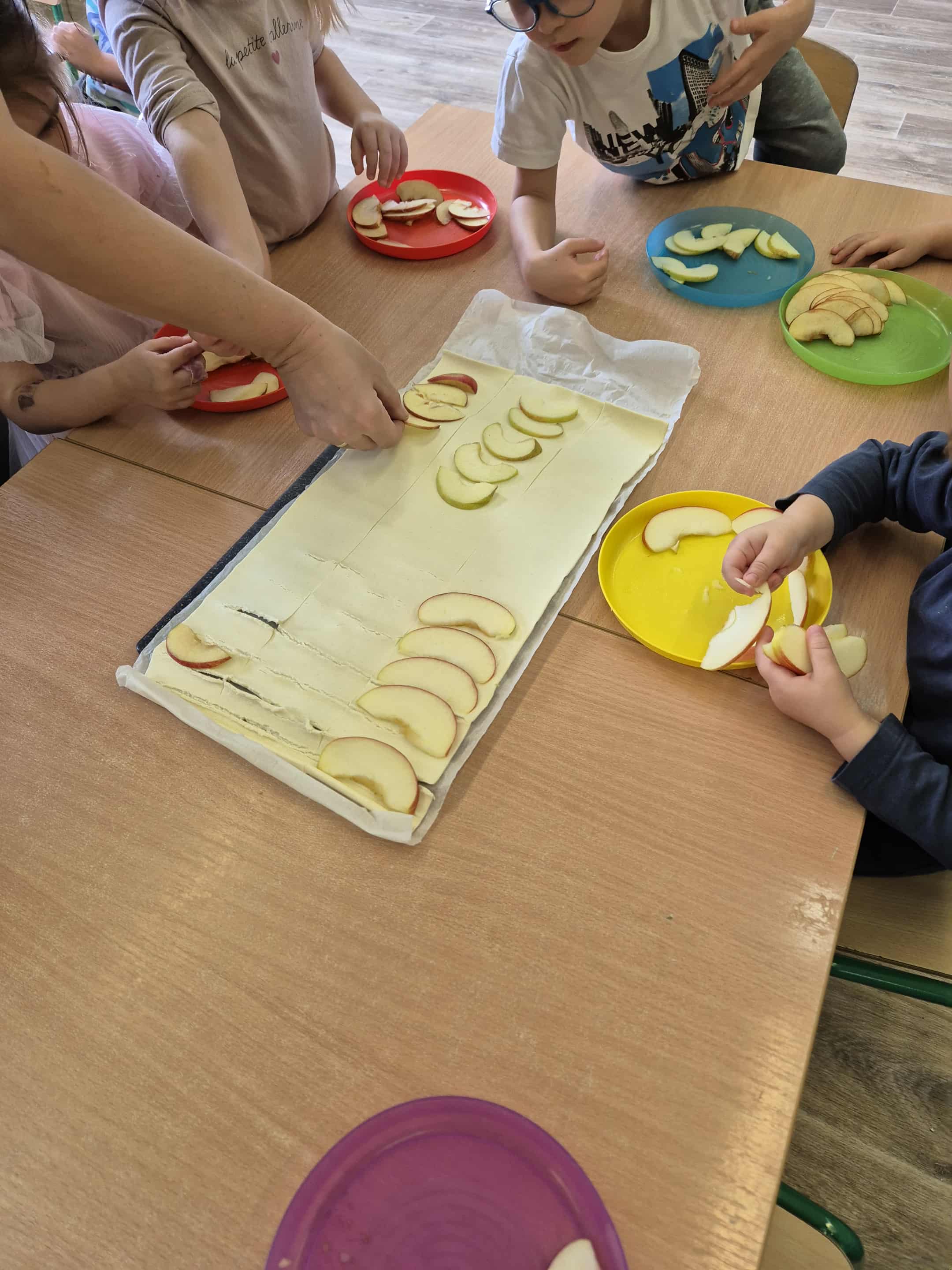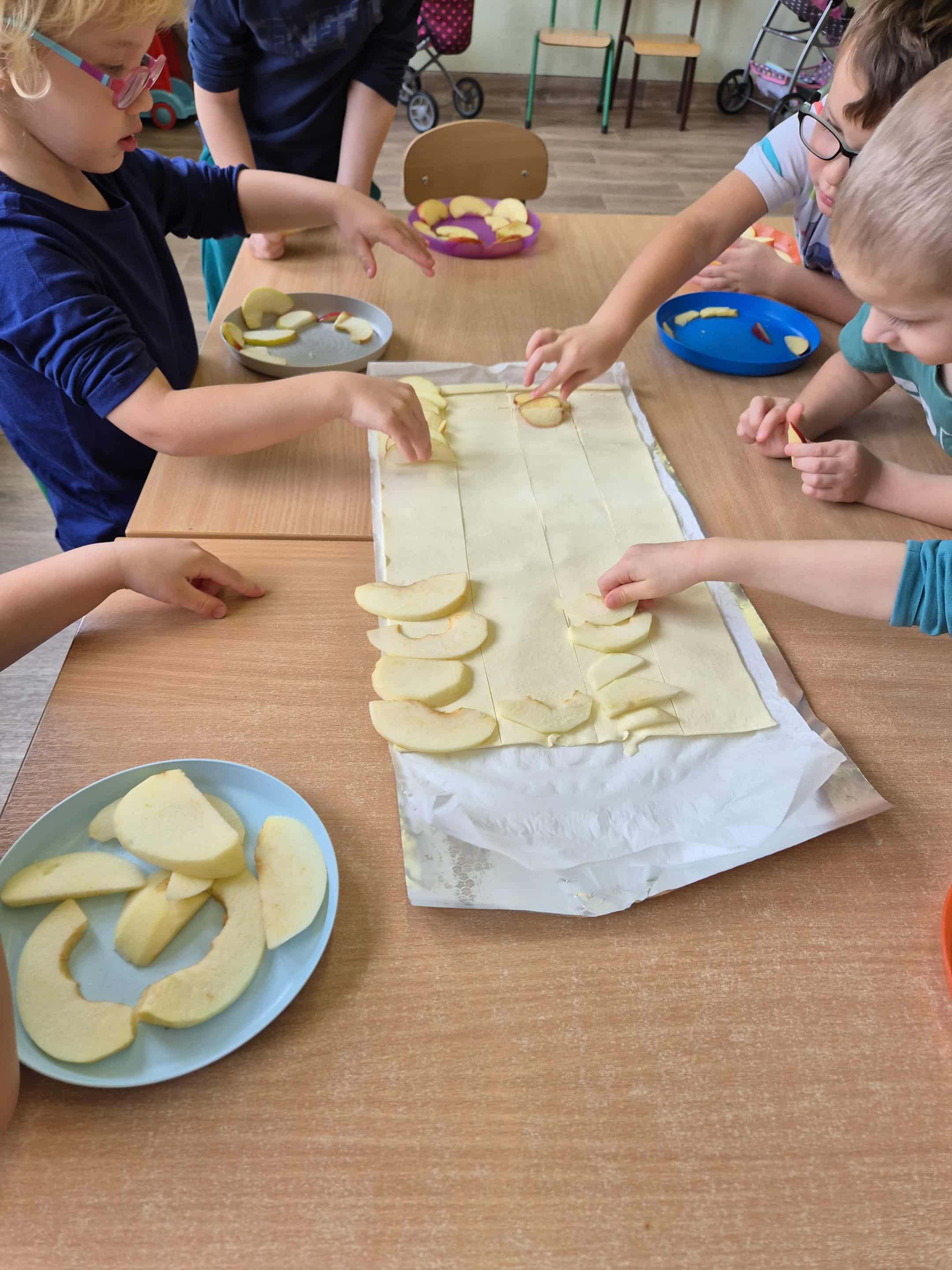 W ostatnich dniach grupa Zajączków ruszyła w podróż kulinarną dookoła świata w ramach innowacji pedagogicznej. Dzieci poznały podstawowe informacje o danym kraju, tym razem była to Polska oraz wykonując pierwsze zadanie kulinarne, którym były róże jabłkowe w cieście francuskim. Zabawy, smaków i radości nie było końca, a zapach pieczonego jabłka jeszcze długo unosił się po przedszkolnym korytarzu.
