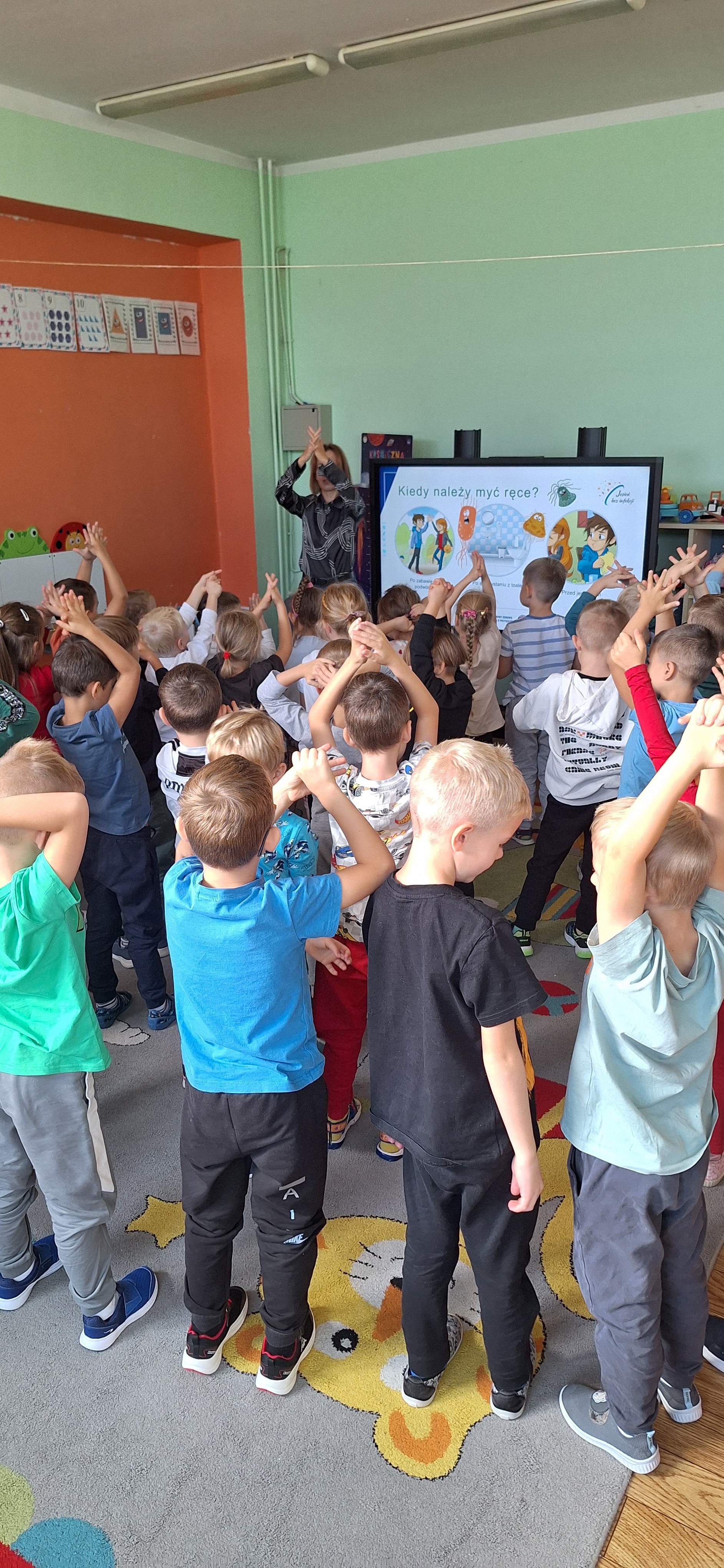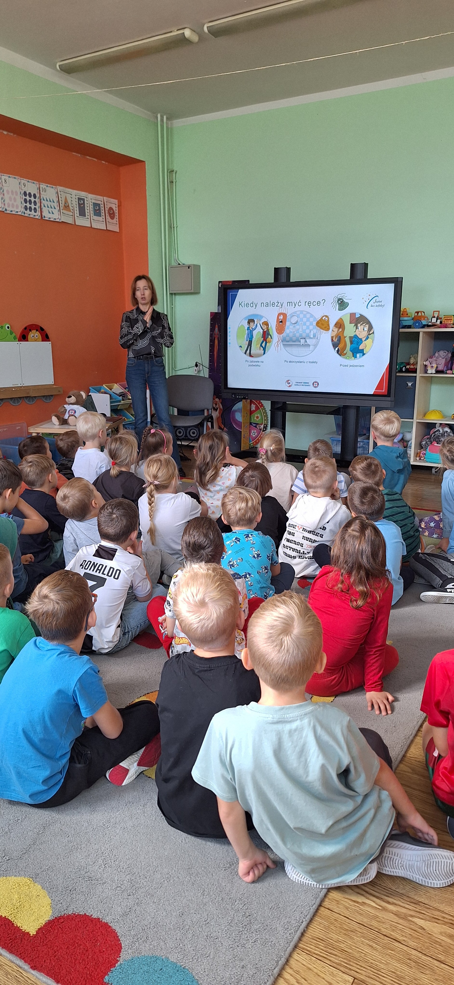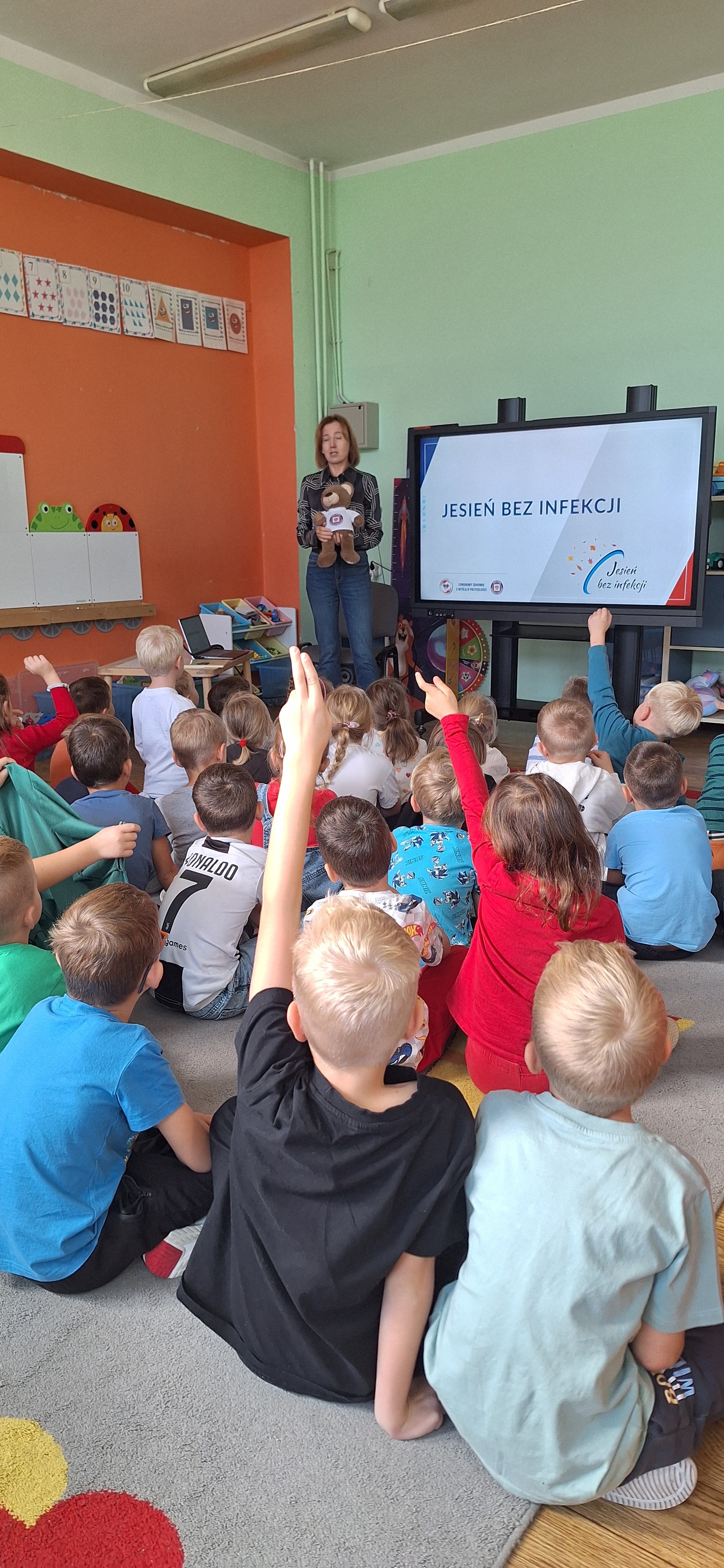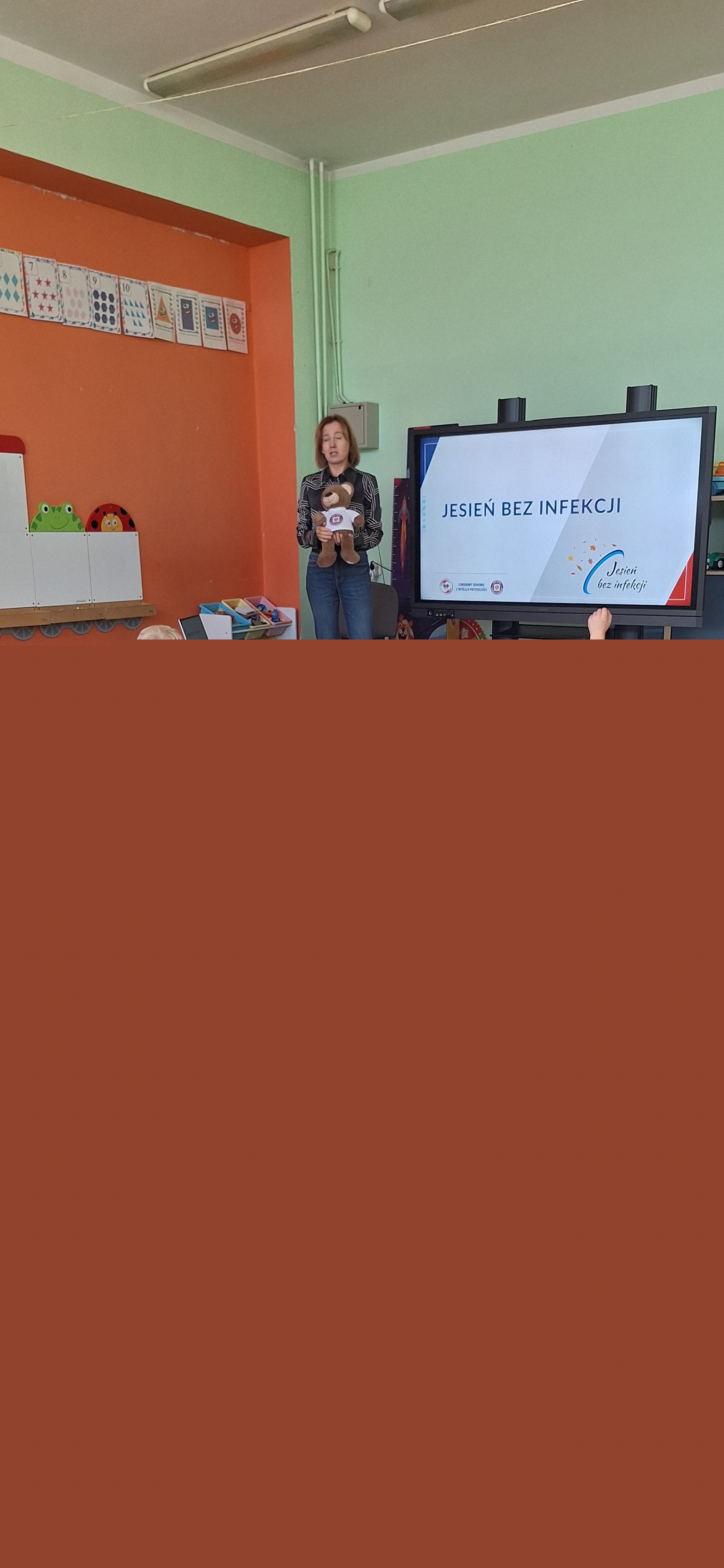 Dnia 2 października nasze przedszkole odwiedziła pani inspektor z Powiatowej Stacji Sanitarno-Epidemiologicznej, która przeprowadziła dla najstarszych dzieci prelekcję pod hasłem „Jesień bez infekcji”. Spotkanie miało na celu uświadomienie przedszkolakom jak ważna jest higiena osobista i odpowiednie nawyki zdrowotne, zwłaszcza w okresie jesiennym, gdy wzrasta liczba infekcji wirusowych i bakteryjnych.
