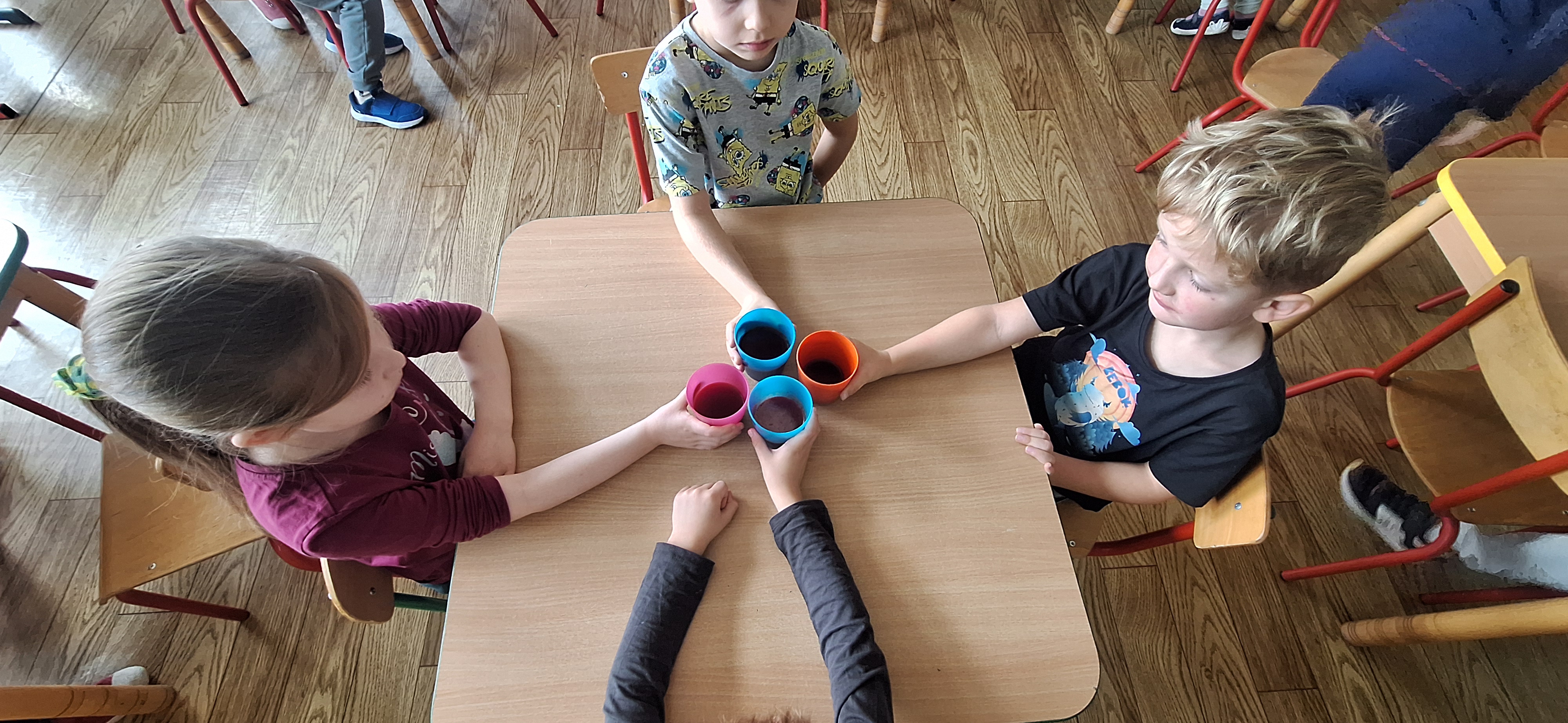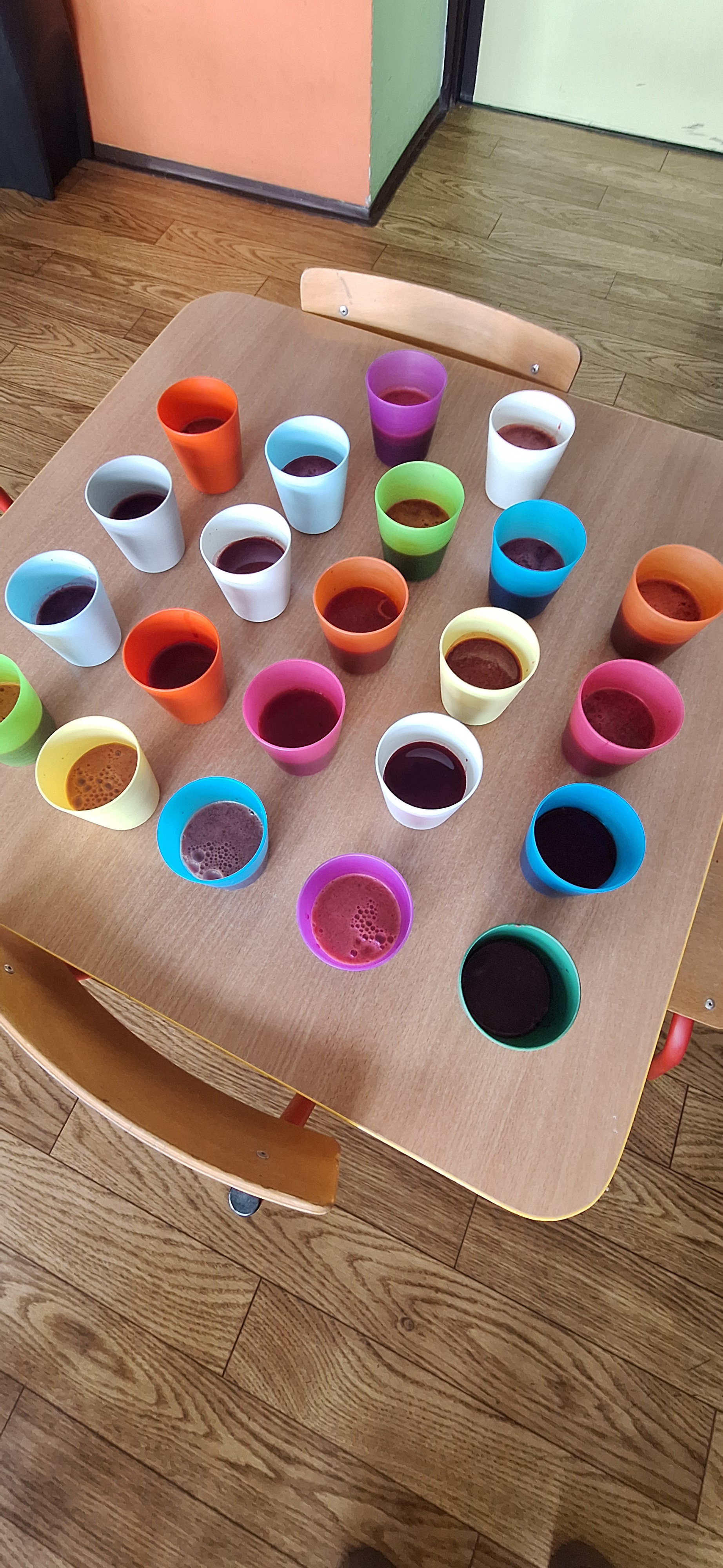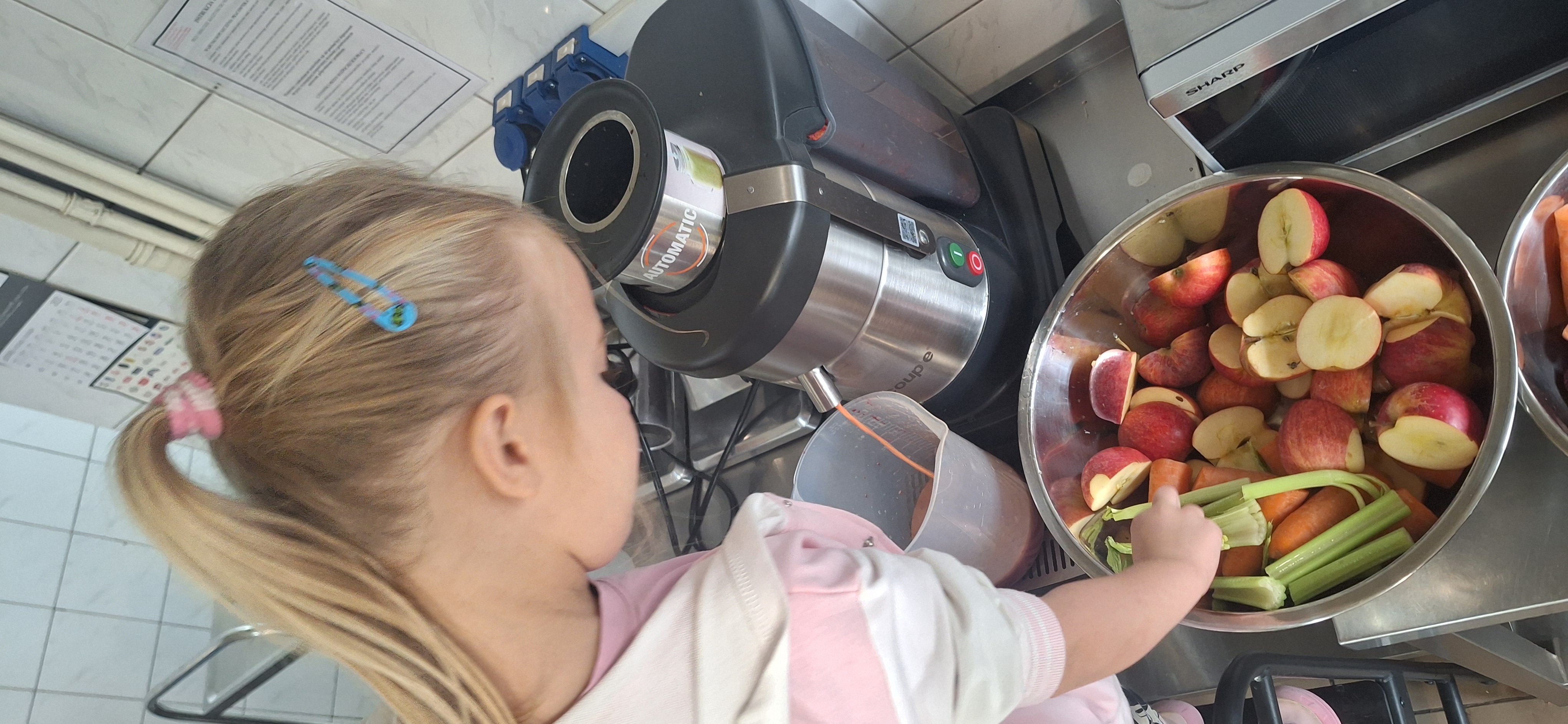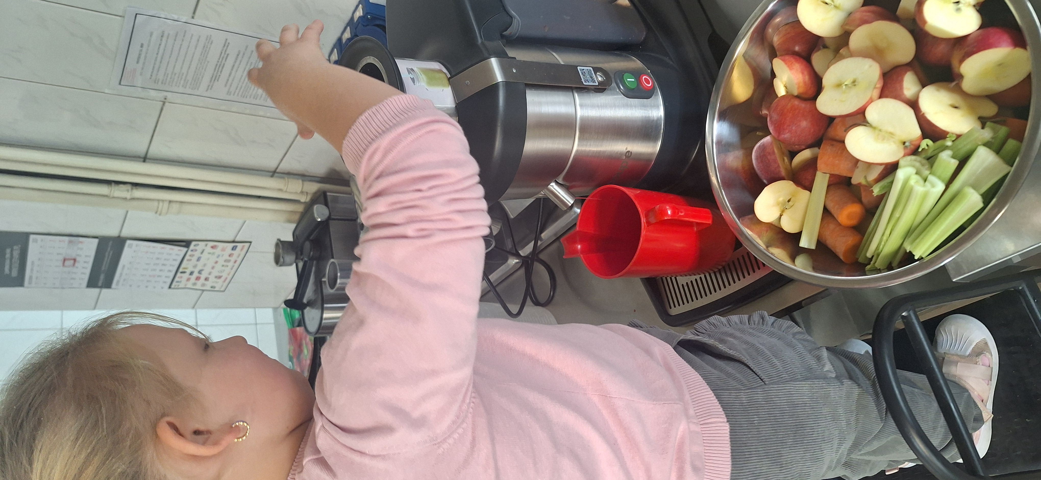 W dniu 17 października dzieci z grupy Misie obchodziły Światowy Dzień Owoców i Warzyw, którego celem było promowanie zdrowego stylu życia oraz utrwalanie wiedzy na temat wartości odżywczych warzyw i owoców. Podczas zajęć dzieci rozpoznawały różne gatunki owoców i warzyw, określały ich kształt, kolor oraz smak, a także dowiadywały się, jak ważną rolę pełnią one w codziennej diecie. Przedszkolaki samodzielnie przygotowywały sok owocowo-warzywny, bogaty w witaminy i składniki odżywcze. Dzieci z dużym zaangażowaniem uczestniczyły w procesie wyboru produktów, obserwowały ich przetwarzanie, a następnie z apetytem degustowały własnoręcznie wykonany napój.